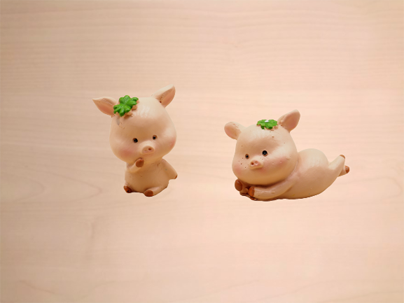 sitzendes Schweinchen vor Holzkleeblatt sort.