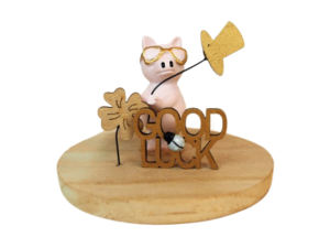 Gold Rosa "Good Luck" Schwein auf Holzscheibe